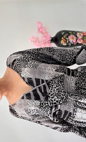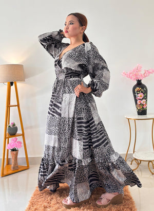 This stunning black and white patchwork maxi dress is a showstopper. Featuring a unique combination of animal prints, including leopard and zebra patterns, this dress has a bohemian-chic flair. The flattering V-neckline, long puff sleeves, and a tiered ruffle hem create a flowy and elegant silhouette. A self-tie waist accentuates your figure for a perfect fit. Made from a lightweight, comfortable fabric, this dress is ideal for a stylish day out, a garden party, or a special occasion