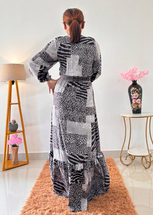 Black & White Patchwork Maxi Dress with Animal Print - Long Sleeve