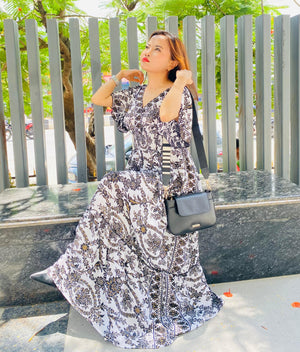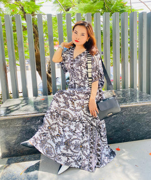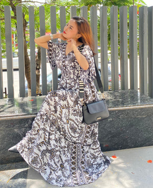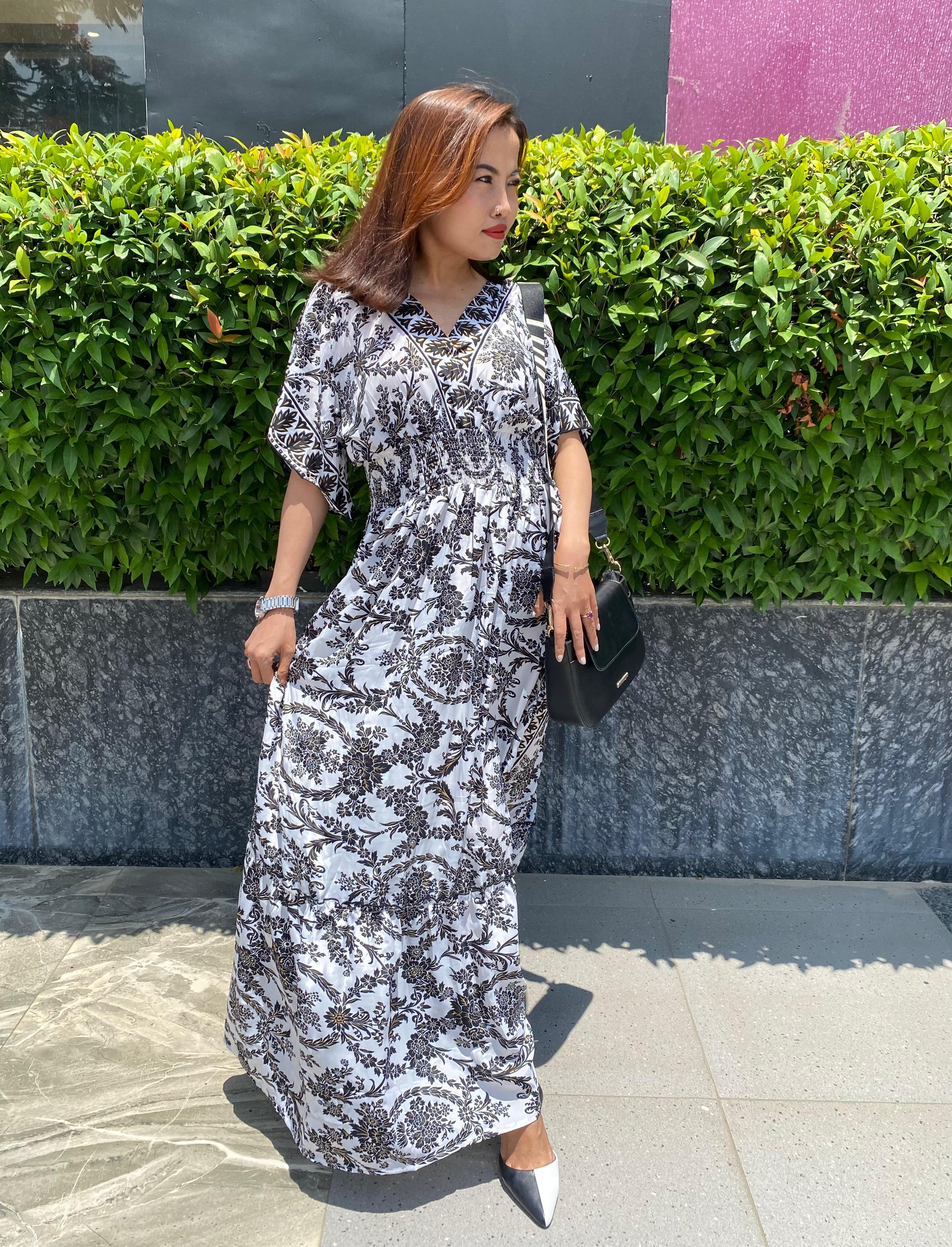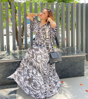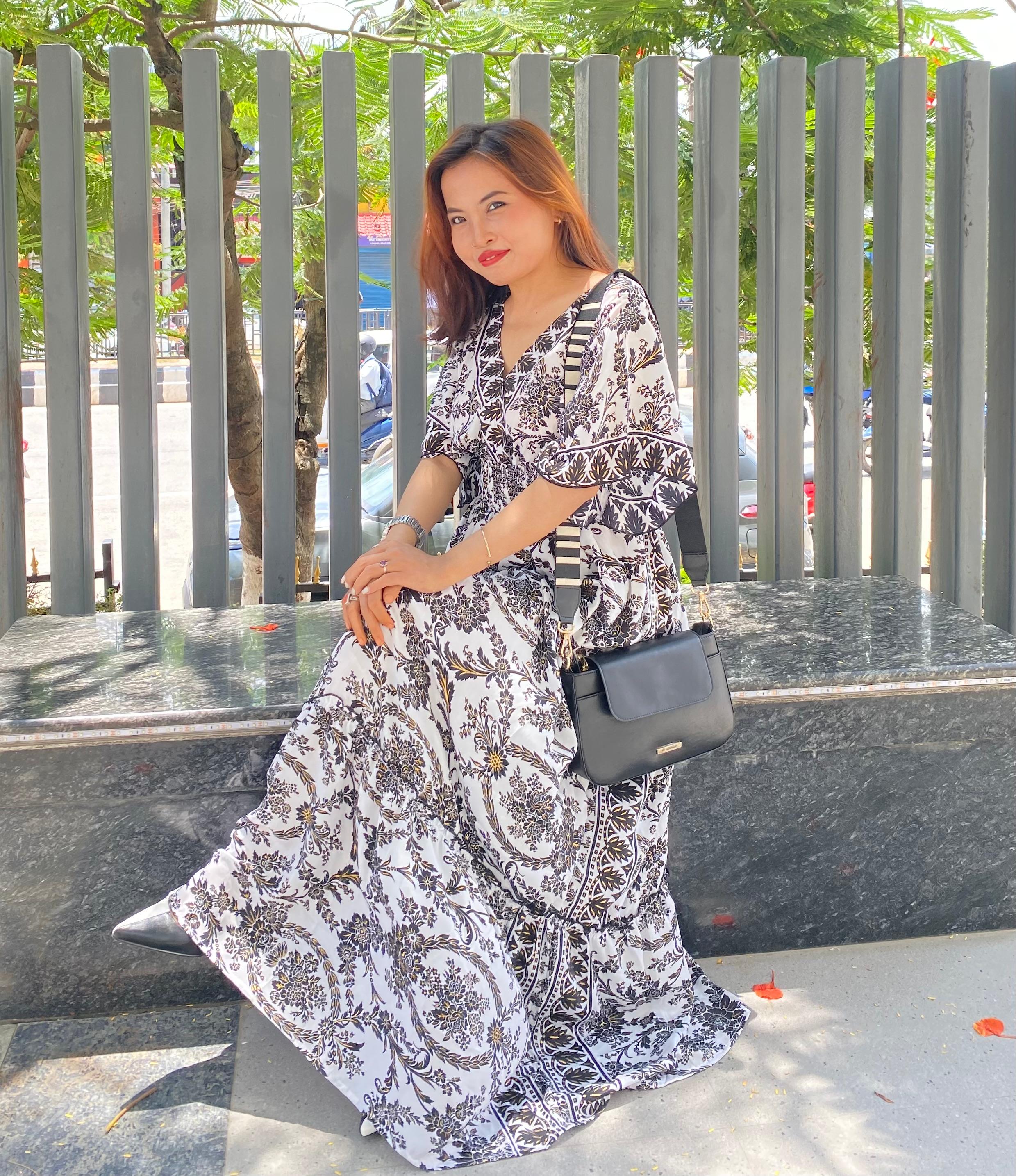 A woman in a stunning black and white patterned maxi dress sits in the sun, showing off her chic style. With a black crossbody bag and striking poses, she brings a blend of bohemian flair and modern elegance.
