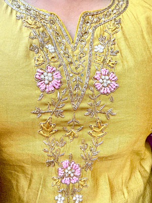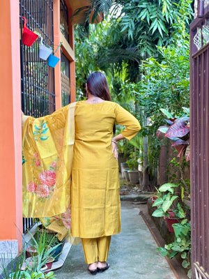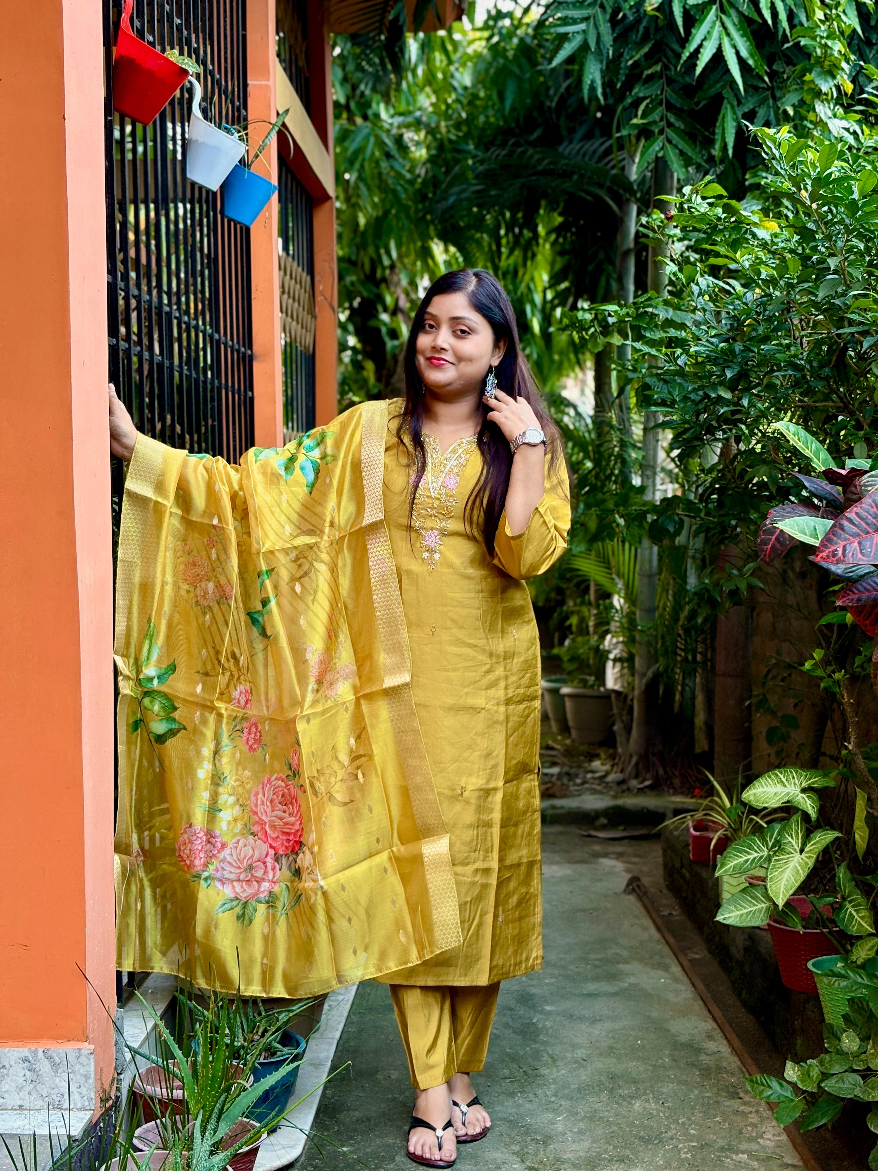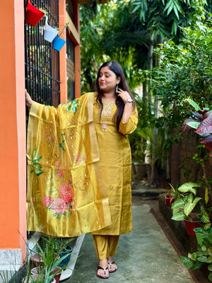 Draped in an exquisite mustard yellow kurta set, the sunlight beautifully catches the subtle sheen of the fabric. The look is elevated by a vibrant organza dupatta featuring stunning hand-painted floral motifs in pink and green. Posing gracefully against a backdrop of lush green foliage and an orange wall, this outfit perfectly blends traditional elegance with the freshness of nature. This is true golden hour style!