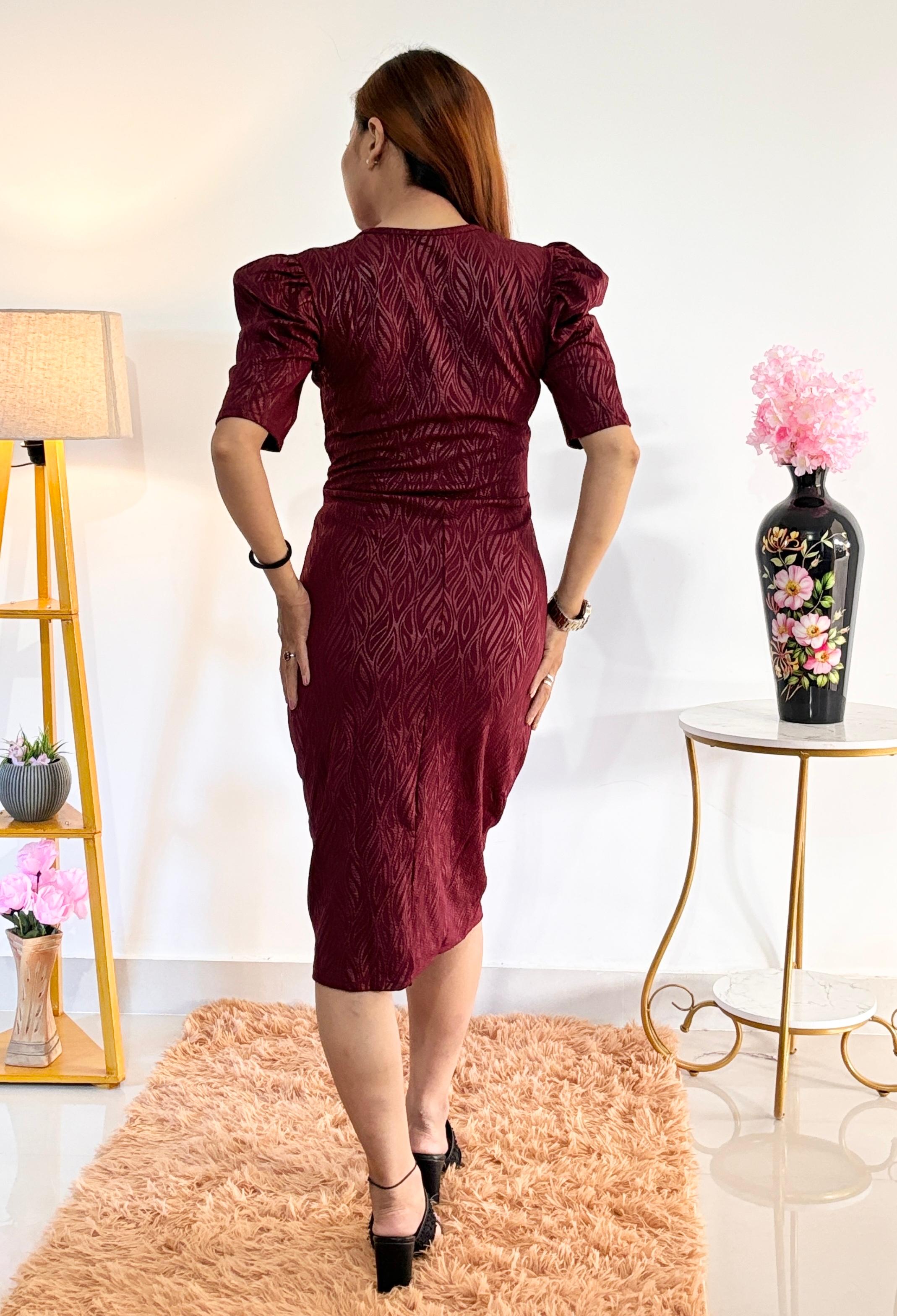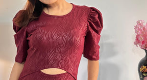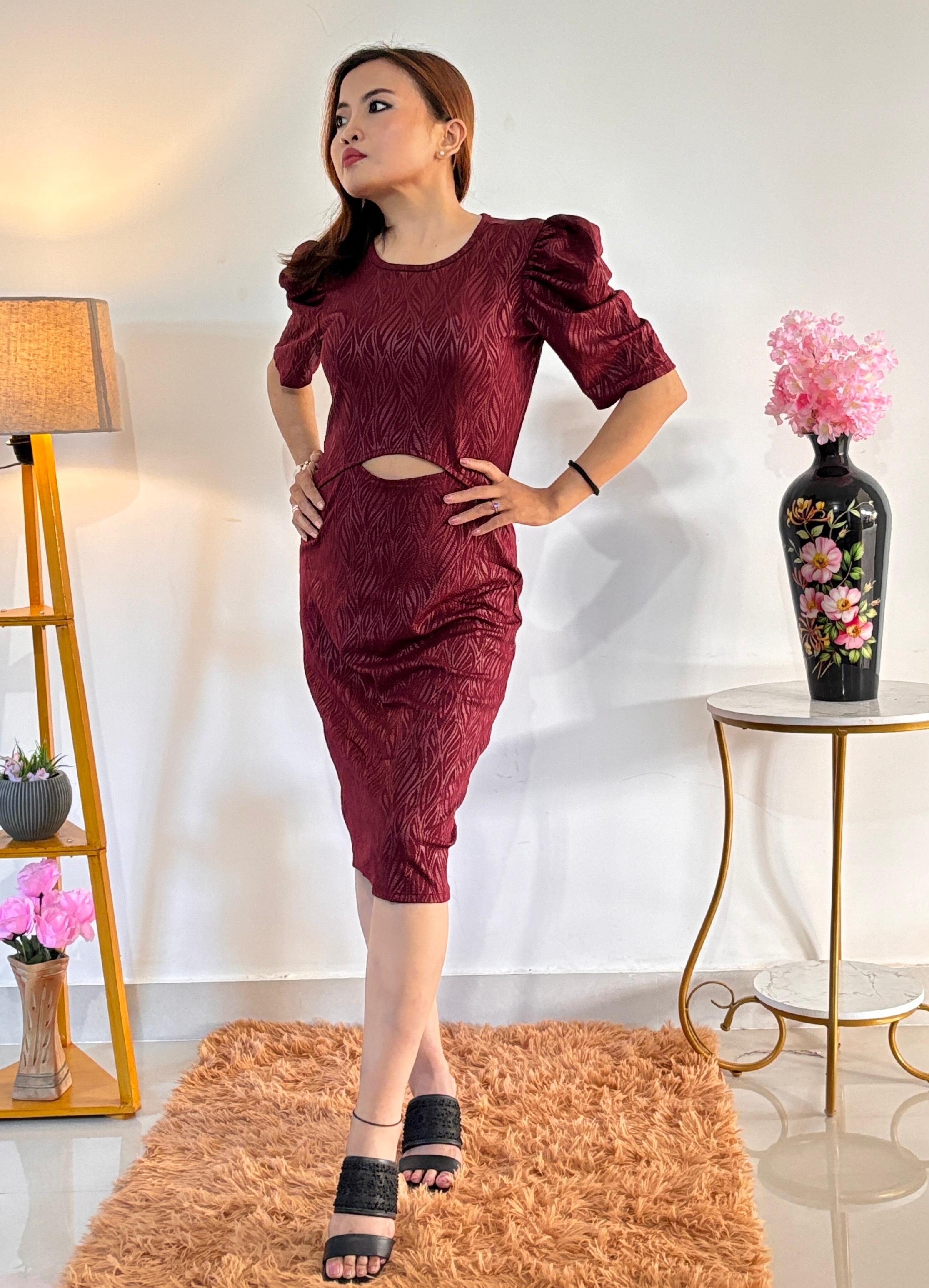 Make a bold statement in this sophisticated maroon midi dress. Crafted from a unique jacquard fabric with a raised, wave-like texture, this dress offers a stylish and elegant look. It features trendy puff sleeves and a modern midriff cut-out detail that adds a touch of allure. The bodycon fit and midi length create a flattering and chic silhouette, perfect for cocktail parties, date nights, or a special evening event