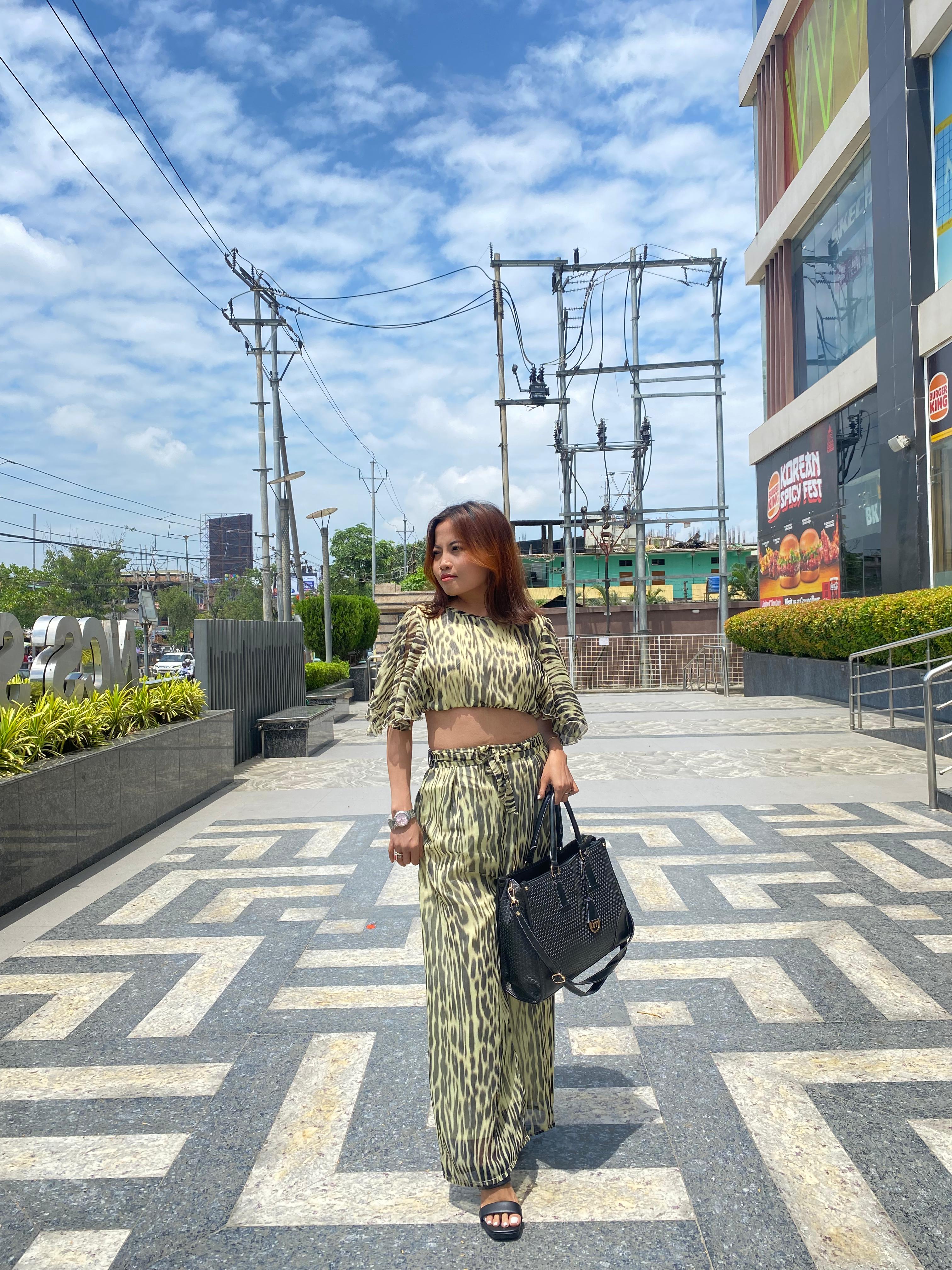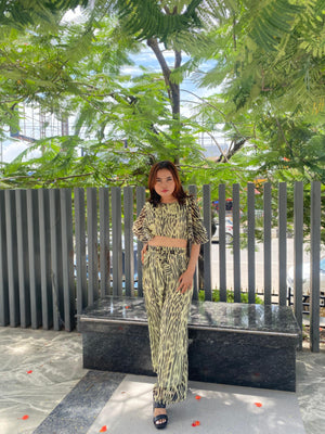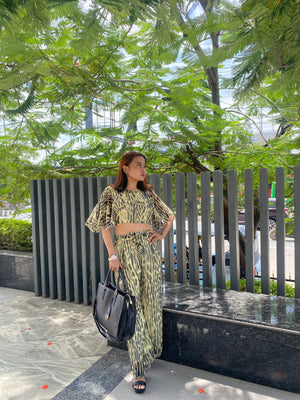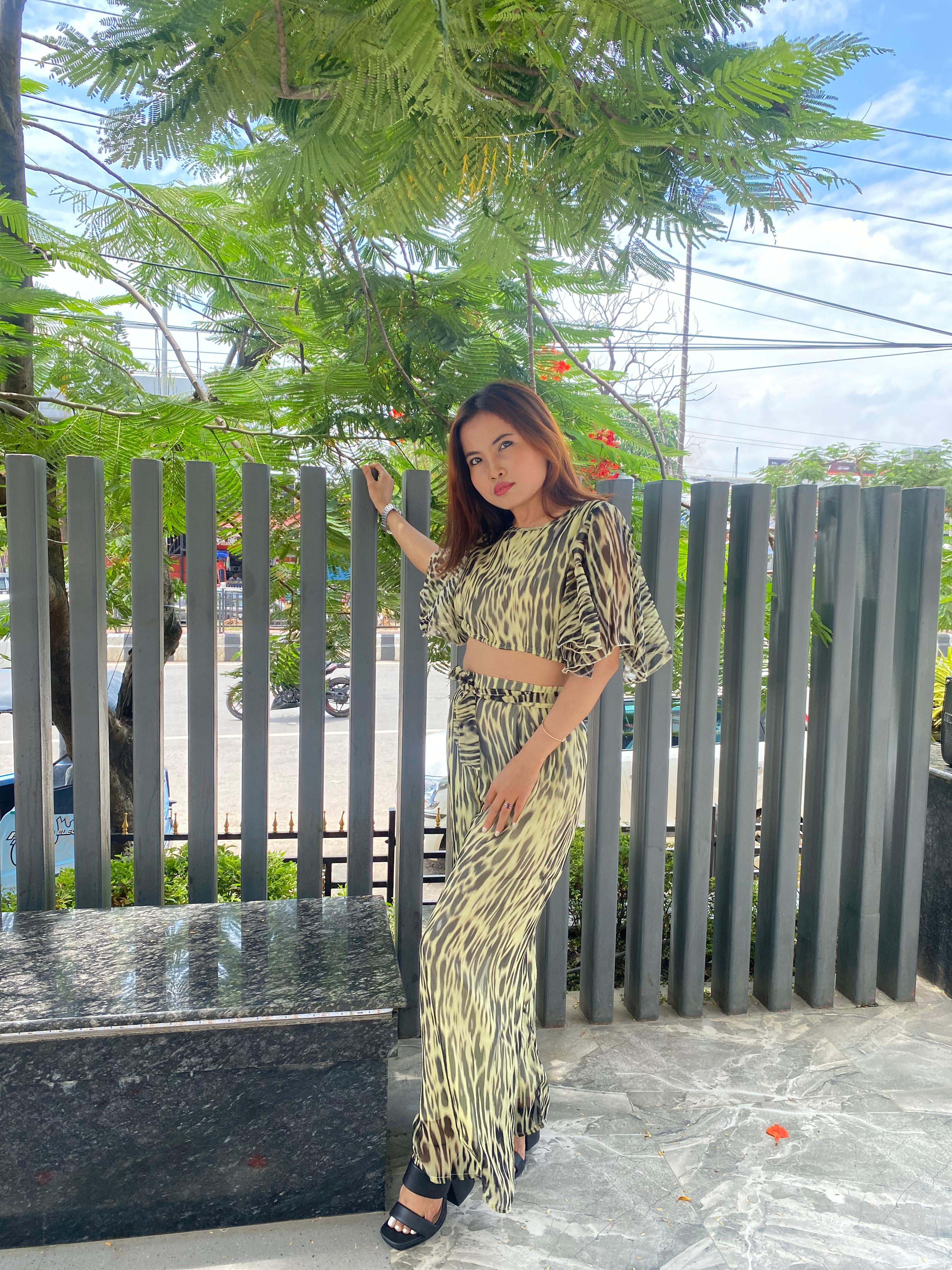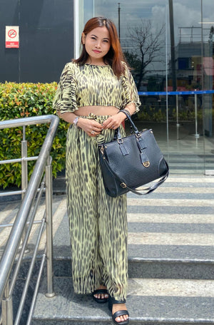 .A cropped, lightweight top with flared sleeves and matching high-waisted, wide-leg trousers. The outfit features a black and light yellow leopard print pattern. The trousers have an adjustable tie waist, and the look is styled with a large black handbag and black block-heeled sandals.