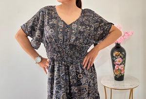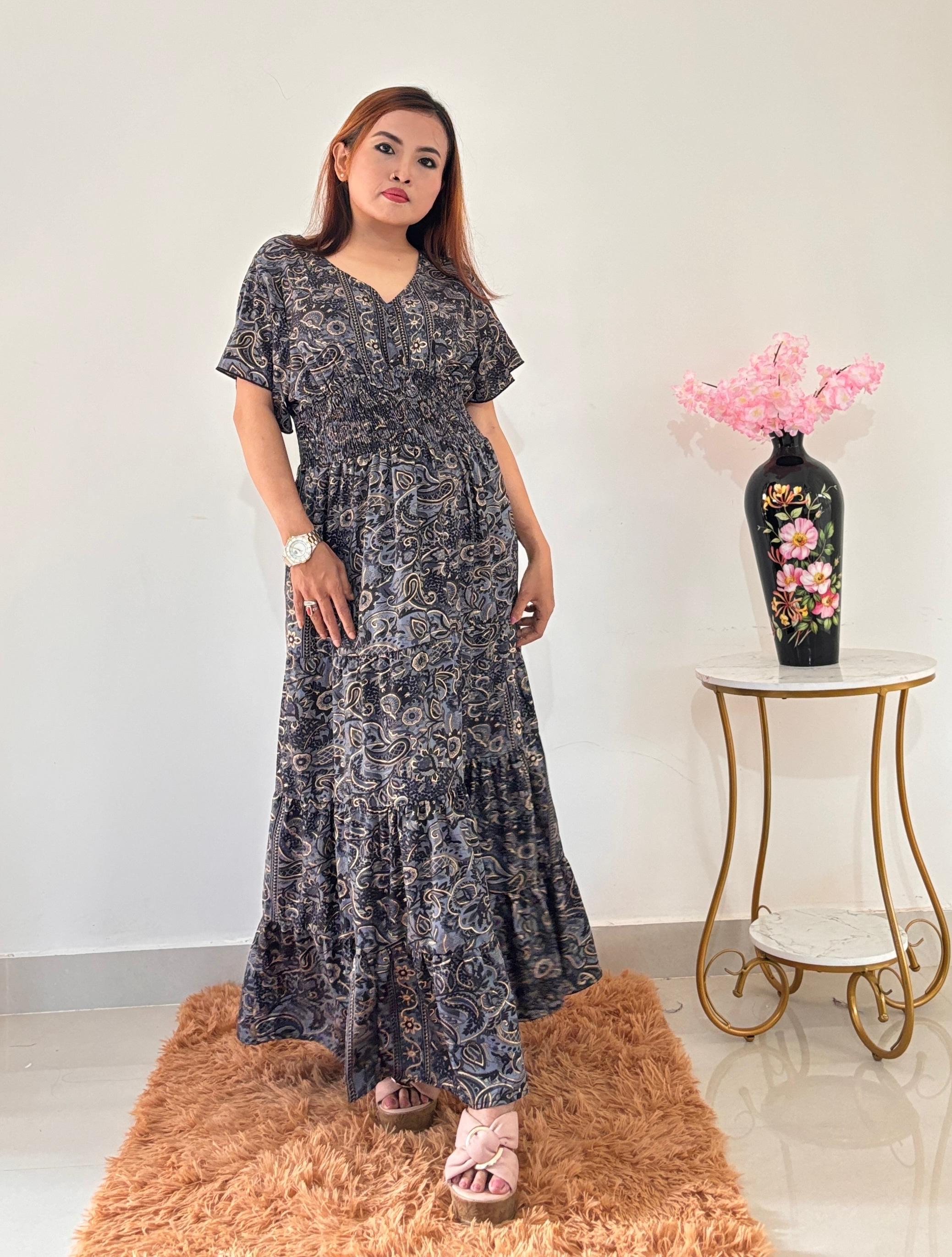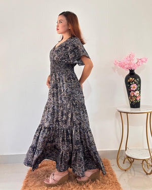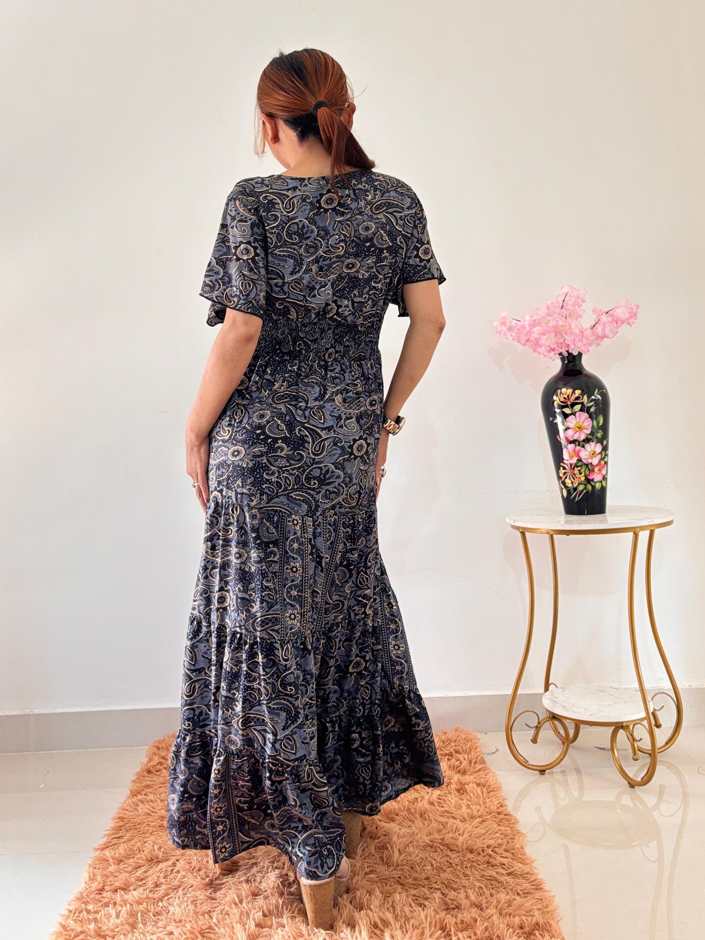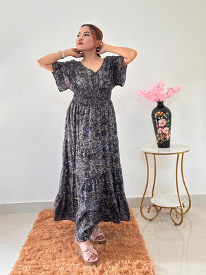 Graceful and comfortable, this maxi dress features a stylish paisley pattern in shades of blue and gold. The V-neckline and short, flowing sleeves create a relaxed and elegant silhouette. A smocked, elasticized waist cinches the figure, while the tiered, flowing skirt adds a touch of bohemian charm. Perfect for a casual day out or a special evening.