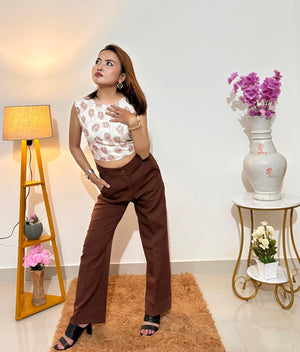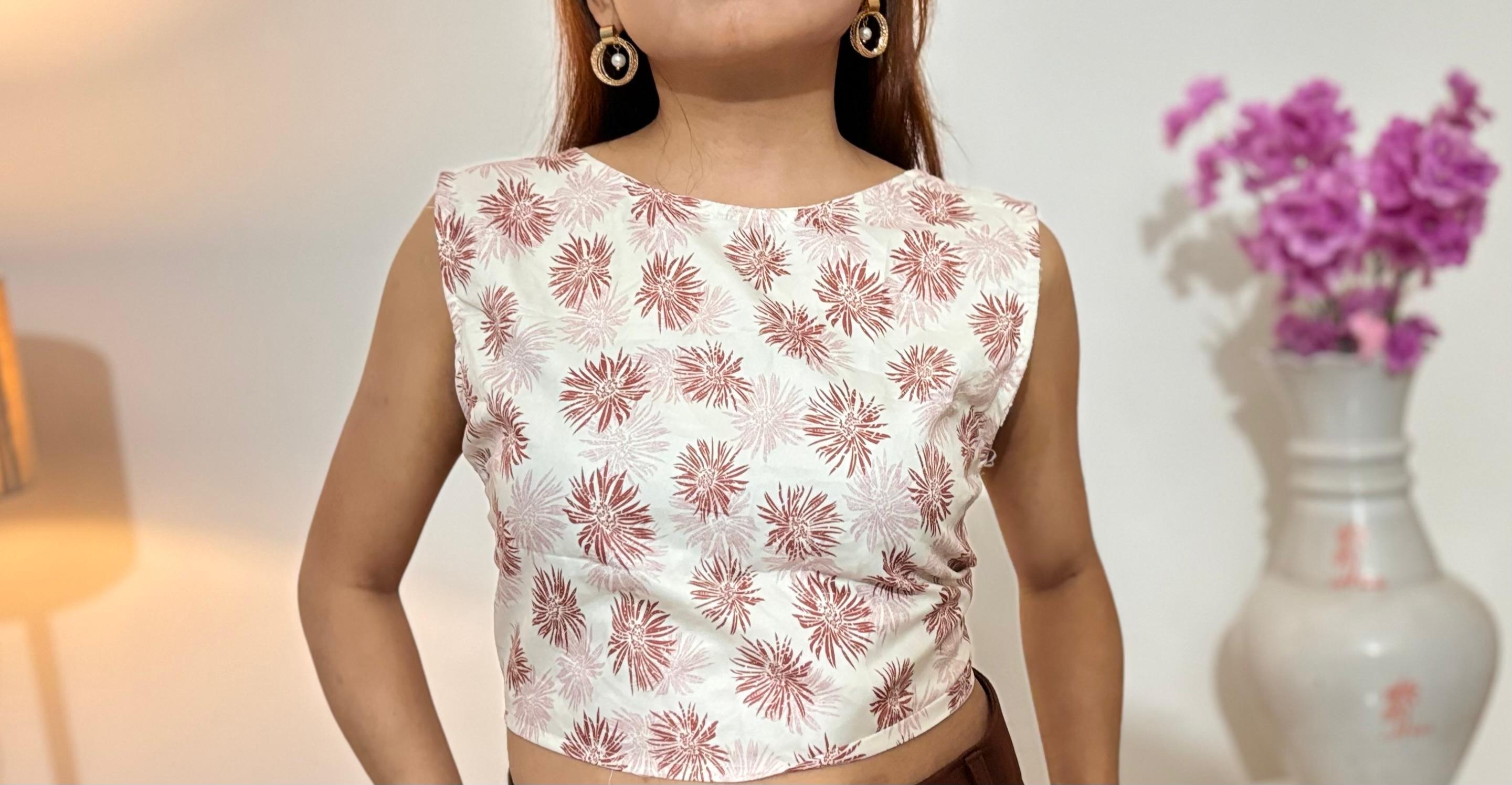 This sleeveless crop top features a beautiful red floral pattern on a light, neutral background. Designed with a classic round neckline in the front, it opens to a stylish deep V-neck with a tie-back closure in the back. Made from a lightweight, breathable fabric, this top is perfect for warm weather and can be dressed up or down