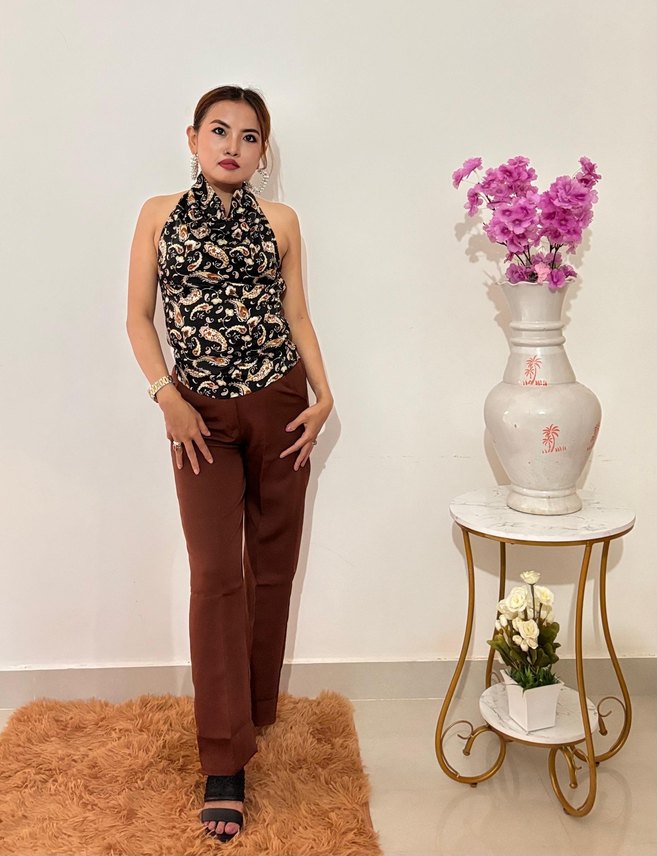 This stunning outfit features a stylish halter neck top with a beautiful paisley print. The top's draped neckline adds a touch of sophistication, while the sleeveless design keeps the look sleek and modern. The look is completed with elegant jewelry and a classic handbag, making it perfect for a night out or a special event.